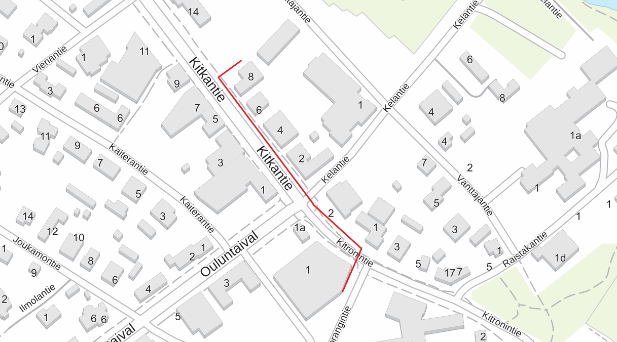 Kartassa punaisella näkyy uuden kaukolämpölinjan reitti, kaivuutyöt tehdään ajotien reunassa, joten jalankulku kiinteistöihin säilyy kevyen liikenteen väylän kautta, työmaan ylitse kulkemista helpotetaan kevyillä silloilla. Kitkantien ajoliikenne säilyy kaksisuuntaisena, mutta työmaa vaikuttaa liikenteeseen ja pysäköintijärjestelyihin, koska kaivuutyöt tehdään tienreunassa paikoitusalueen kohdalla. Tarkemmasta aikataulusta tiedotetaan lisää myöhemmin.